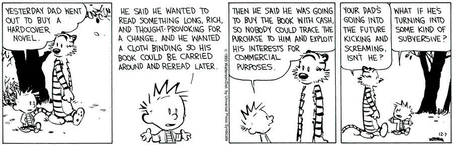"Yesterday Dad went out to buy a hardcover novel. He said he wanted to read something long, rich and thought provoking for a change. He also said he was going to buy the book with cash, so nobody could trace the purchase to him and exploit his interests for commercial purposes" - Calvin and Hobbes, Watterson, December 1993.